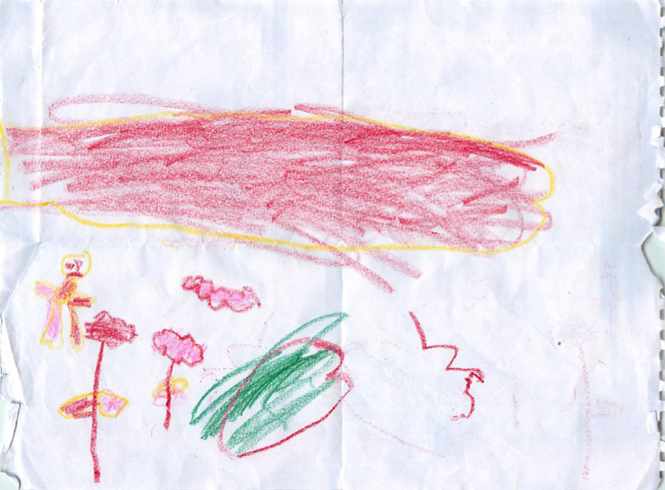 A 4-year-old girl from Homs drew this for a psychiatrist in Amman. The girl had witnessed her uncle killed by a tank, and kept repeating "Uncle, tank, blood," according to the psychiatrist. The girl's mother says their neighbor was raped by Syrian soldiers the same day. (Yassar Kanawati)