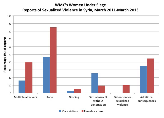 When it comes to men, more than 90 percent of the reports of sexualized violence have been allegedly perpetrated by government forces, which can perhaps be explained by the fact that most of these attacks occurred in detention facilities. Long used as a weapon against prisoners in Syria as in much of the world, rape appears to be utilized during this conflict in horrifyingly soul-crushing, creative ways. Beyond simply raping detainees, shabiha members or Syrian army soldiers have reportedly carried out the rapes of family members or other women front of prisoners.