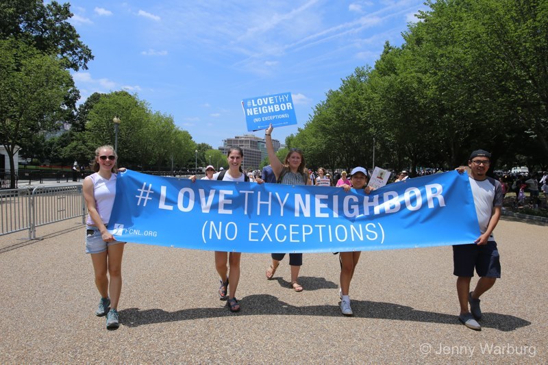 A group of five demonstrators holding up a banner that reads "#LoveThyNeighbor (No exceptions)" (Photo by Jenny Warburg)