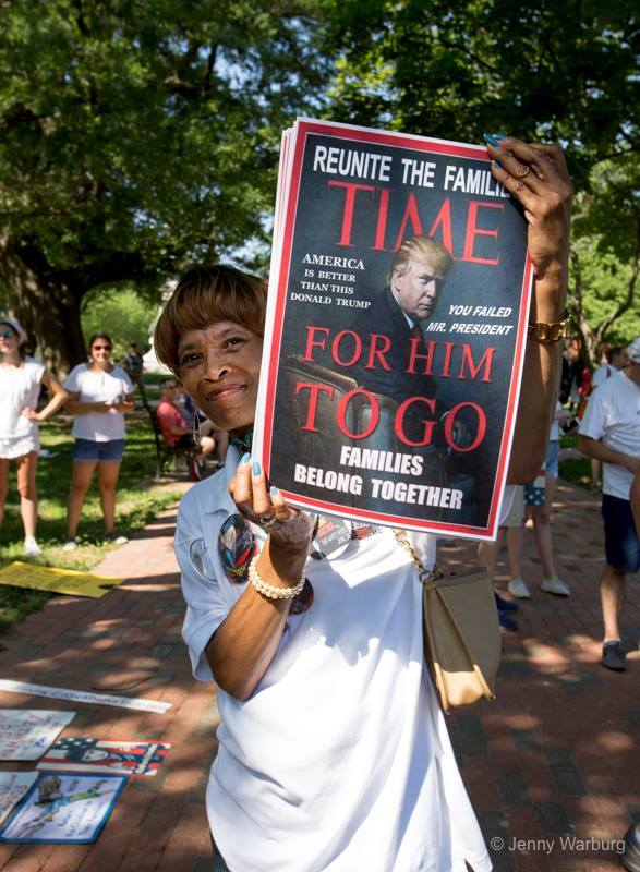 A woman holds up a poster with a mock TIME Magazine cover with President Trump that reads "Reunite the Families. TIME for him to go." (Photo by Jenny Warburg)