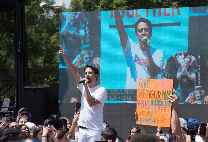 Lin-Manuel Miranda, Congresswoman Pramila Jayapal, Ai-jen Poo, and other demonstrators leading the March and holding up a large banner that reads "Families Belong Together." (Photo by Jenny Warburg)