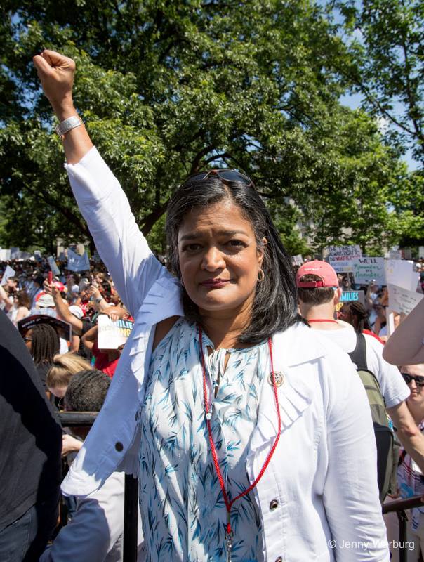 Congresswoman Pramila Jayapal holds a fist up in the air while surrounded by other demonstrators. Congresswoman Jayapal was the only member of Congress among the approximately 575 people arrested last week for civil disobedience during a sit-in in opposition to the administration's immigration policies. (Photo by Jenny Warburg)