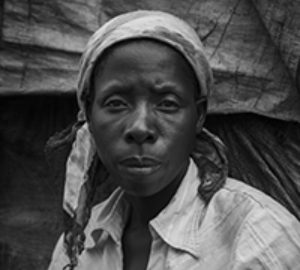 A woman sits, microphone in hand, behind a billowing, black curtain—further obscured by a black veil that hides her face, her body, and even her hands—as she finds the courage to recount her rape by government soldiers in Minova, Democratic Republic of Congo.