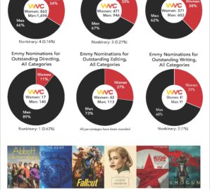For the annual Primetime Emmy Awards, the total numbers of women who get nominations in non-acting categories have continued to hit a proverbial “glass ceiling” of below 40% every year. The total numbers have not changed from the previous year: For the 2023 Primetime Emmy Award nominations, 33% of the non-acting nominees were women, the same percentage for the 2022 Primetime Emmy Awards. And in typically male-dominated categories, things are getting worse for women.
