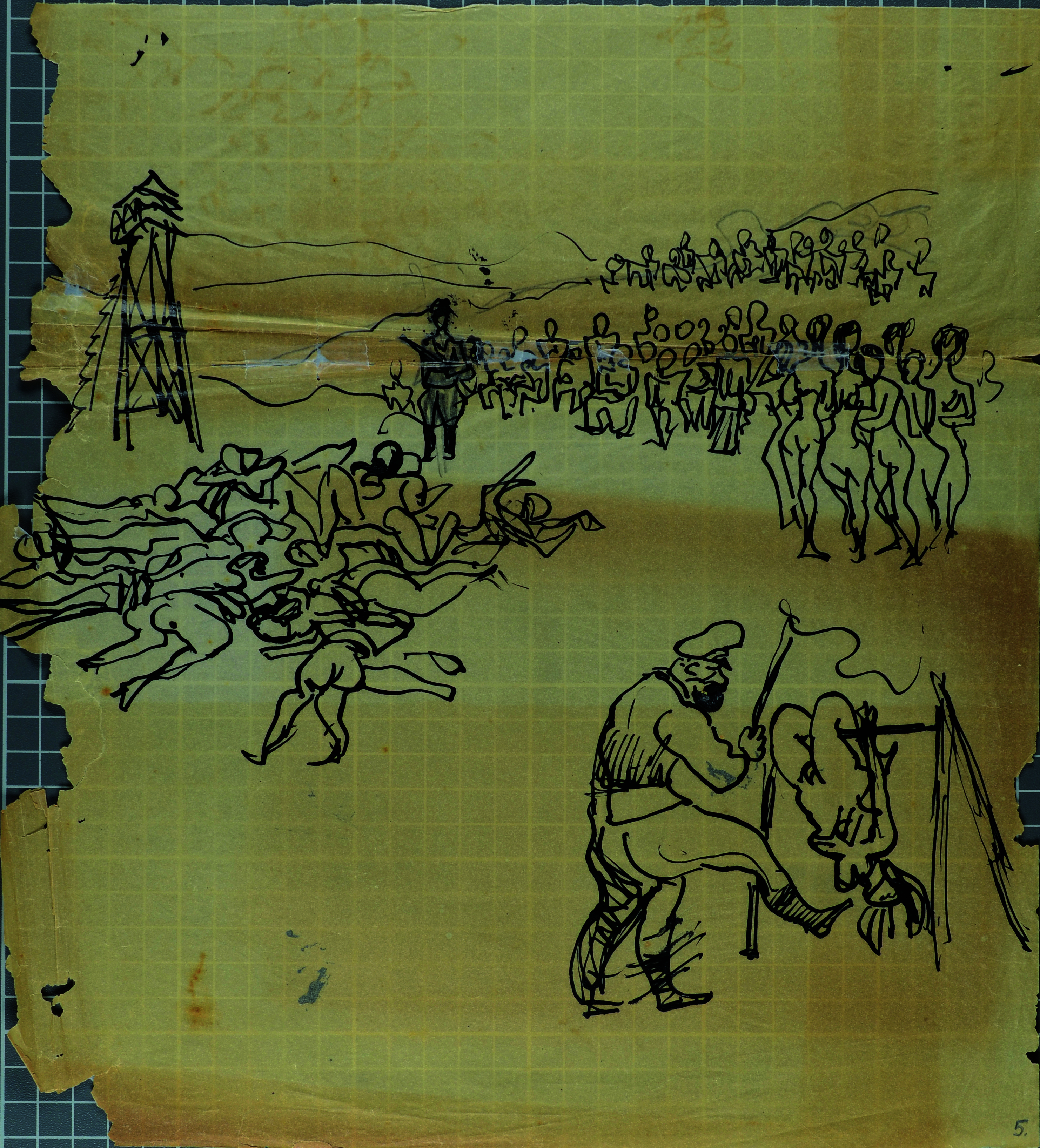 Another work, by the Ukrainian artist and Holocaust survivor Wilhelm Ochs, later Zeev Porath, was drawn in secret while he was imprisoned in the Janowska concentration camp as a slave laborer. The scene depicts Jewish women being undressed, tortured, and killed by Nazis.