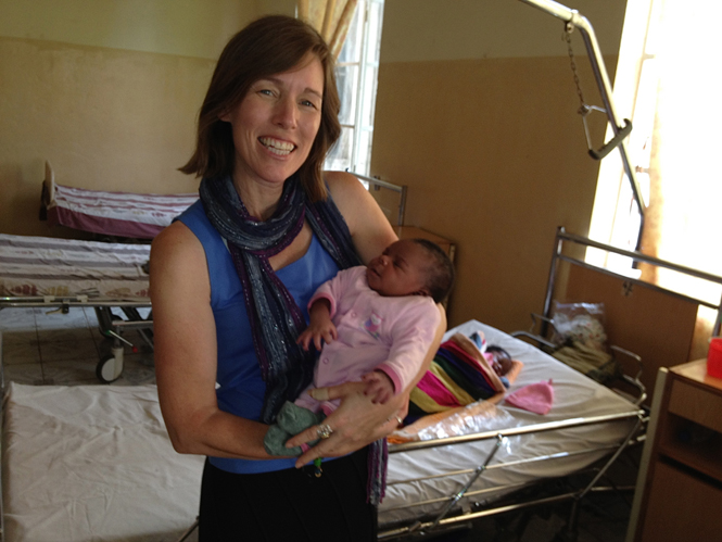 The author holds an infant at Panzi Hospital. On her latest trip there, De Reus conducted focus groups to learn what survivors felt about the children they were giving birth to due to rape. De Reus says the mother of this particular 8-day-old was struggling to accept the baby; she does not appear in the photo to protect her identity for safety reasons.